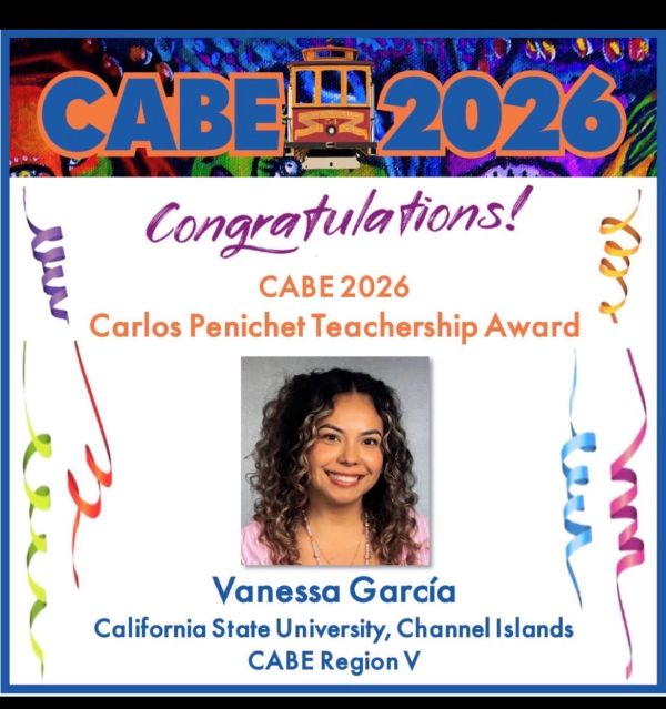 Vanessa Garcia, Bilingual teacher candidate, earns an award from the statewide organization California Association for Bilingual Education (CABE).