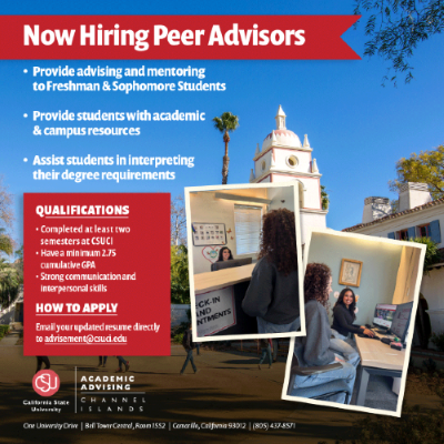Academic Advising is hiring peer advisors for Spring 2026 and Fall 2026. Applicants must meet qualifications to be considered.