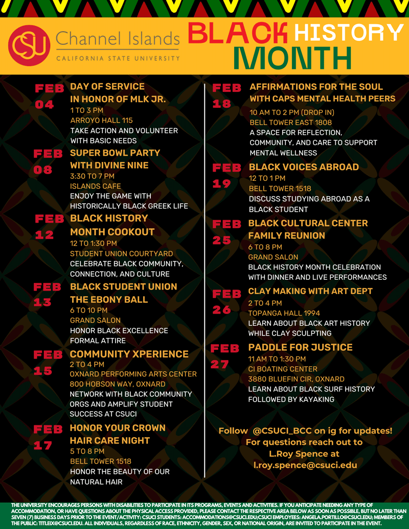 Join us in celebrating Black History Month by getting involved with the events and activities hosted by CSUCI’s Black Cultural Center.