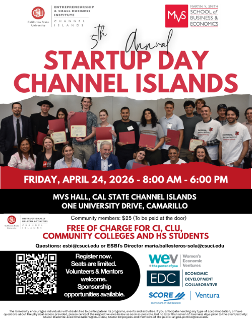 Startup Day Channel Islands is only 10 days away at MVS Hall, April 24, from 8 a.m. to 6 p.m. Free to attend and all majors welcome. Breakfast and lunch included. Connect with other students, mentors, and judges.