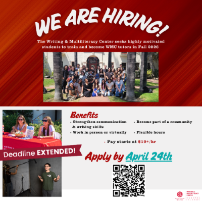 The Writing and Multiliteracy Center (WMC) is currently looking for new awesome tutors! If you're interested in enhancing your writing and communication skills as a tutor, now is your chance to apply.